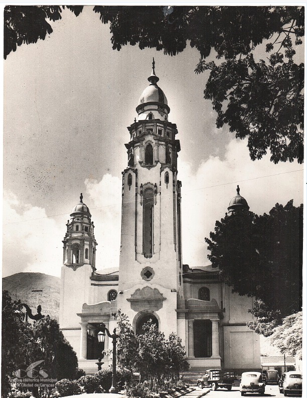 El Panteón Nacional, Caracas, década de 1940-1950: Una majestuosa vista frontal de la torre central y la fachada del Templo, donde reposan los restos del Libertador Simón Bolívar y otras figuras ilustres de la nación. La imponente estructura, que originalmente fue una iglesia, se yergue bajo un cielo dramático, destacando su arquitectura neogótica y la cúpula central. El encuadre en blanco y negro, con la presencia sutil de vegetación y vehículos de época en el primer plano, subraya la solemnidad y la importancia histórica de este santuario a la Patria